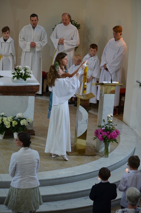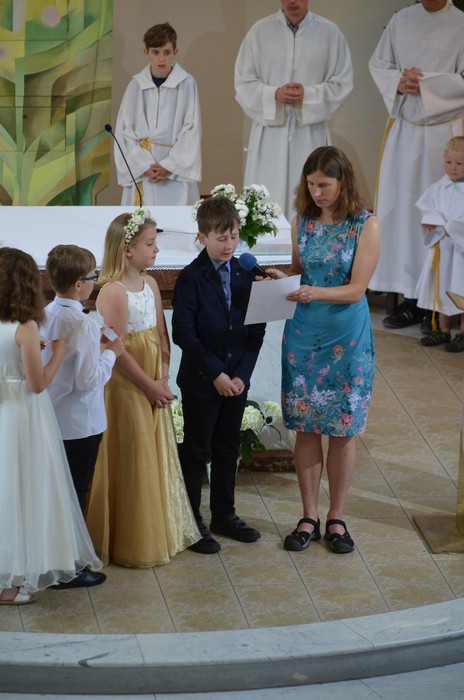 Slavnost Nejsvětější Trojice v neděli 4. 6. byla velkou slavností pro mnoho rodin naší farnosti. Již v půl desáté se scházeli „malé nevěsty“ a „elegantní mladíci“ před kostelem. V ruce svírali své křestní svíce. Čekalo je dnes první svaté přijímání, na které se během uplynulého roku připravovali. Již v pátek předtím přišli poprvé ke svátosti smíření. Během slavnostní bohoslužby obnovily děti své křty. S hořící svící vyznaly svoji víru. Společně přinesly obětní dary a přečetly přímluvy za své rodiny i celý svět. Ale co bylo nejdůležitější pro všechny v dnešní den? 18 dětí poprvé přijalo eucharistii (jedno dítě již o měsíc dříve). Páter Evžen při promluvě připodobnil Nejsvětější Trojici rodině. Otec, matka a dítě/děti mají vytvářet pevné pouto lásky. V patnácti rodinách nejen z naší farnosti se jistě dnes toto pouto posílilo. Rodiče s dětmi a dalšími příbuznými šli po skončení obřadu dále slavit do svých domovů. Celkem v naší farnosti letos poprvé přijalo svátostného Ježíše 19 dětí.